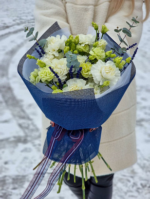 Состав букета: три эустомы, пять гвоздик, две шабо, эвкалипт, лаванда, упаковка